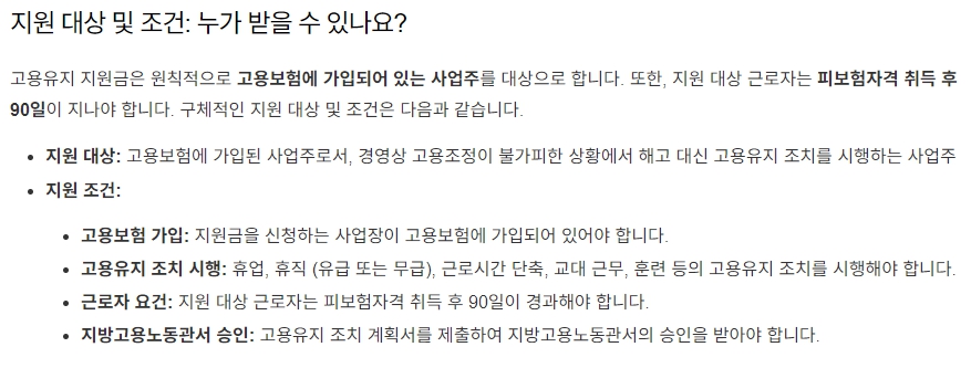 • 기업 부담 완화: 인건비 부담을 덜어주어 기업이 경영 위기를 극복하고 사업을 유지하는 데 도움을 줍니다.